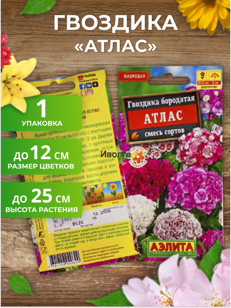 Гвоздика бородатая "Атлас" смесь сортов - травянистое растение с многочисленными узловатыми стеблями высотой 50 см. Стебли прямые, прочные, листья сидячие, ланцетные с серо-голубым оттенком. Цветки бархатистые, ароматные, белоснежные, красные, пурпурно-фиолетовые, собраны в плотные щитковидные соцветия диаметром 10-12 см. Зимостойка, предпочитает освещенные участки с легкими плодородными почвами, может расти в полутени.